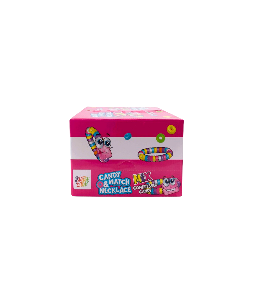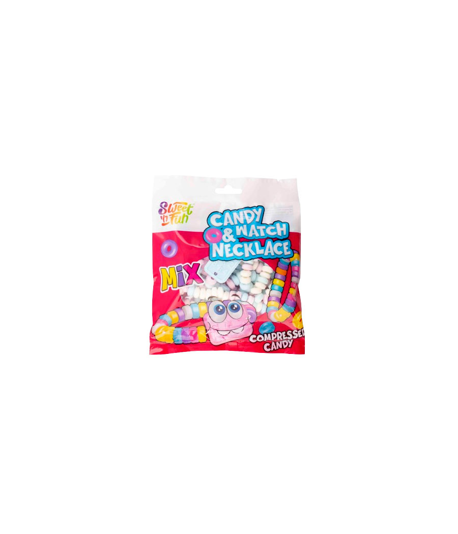 Set cu ceasuri și coliere din comprimate dulci, ambalate individual în pungi. Produs colorat și jucăuș, apreciat de copii atât pentru gust, cât și pentru partea de joacă. Se pretează excelent pentru pachete cadou, serbări, distribuire în colectivități și activități tematice.