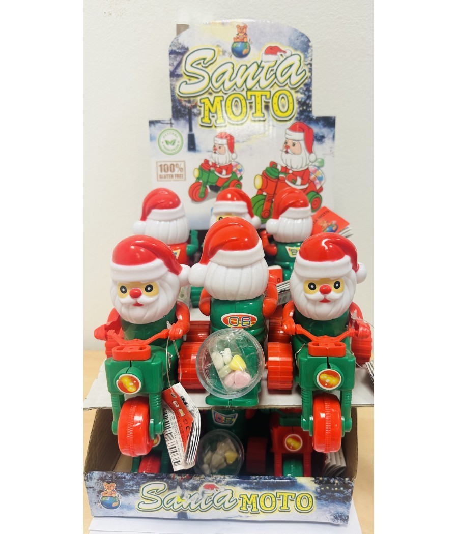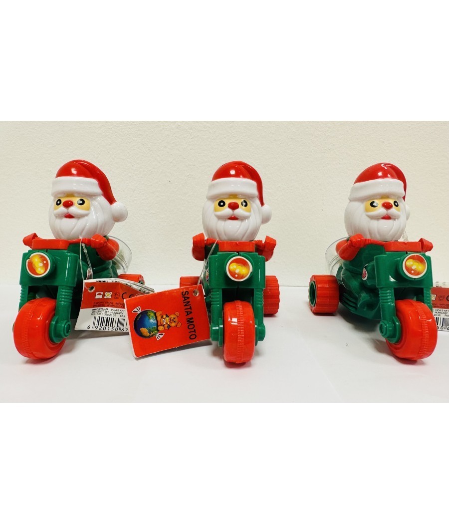 Moș Crăciun pe motocicletă, într-o jucărie veselă și haioasă, perfectă pentru pachete cadou de sărbători, serbări și surprize pentru copii. Design colorat și distractiv. 🎅