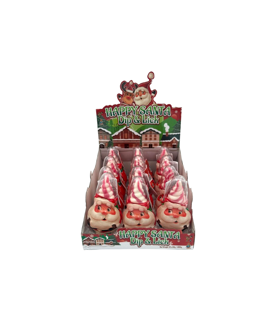Dulciuri Dip & Lick în ambalaj festiv cu Moș Crăciun: baton dulce de înmuiat în pudră aromată. O combinație distractivă pentru cei mici, ideală pentru pachete cadou și serbări de sărbători. 🎅