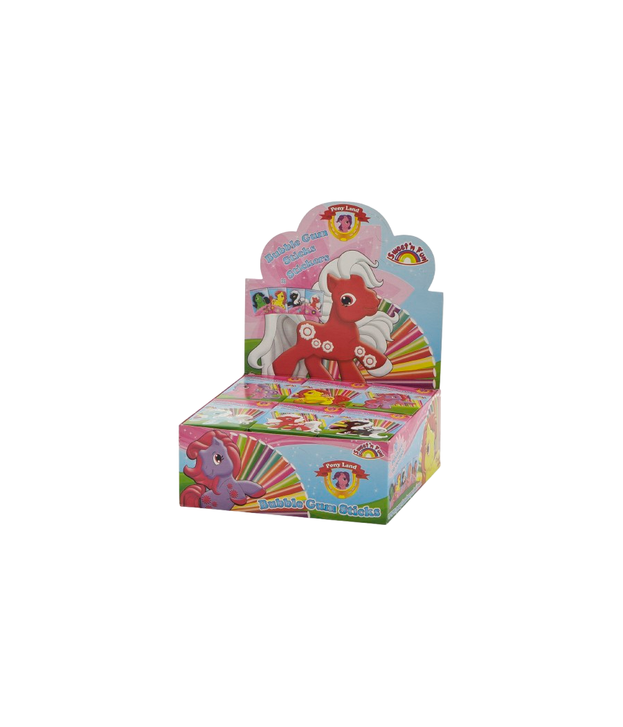 Gumă de mestecat ambalată sub formă de creion cu tematică Ponei. Produs cu aspect vesel, ușor de oferit copiilor și apreciat pentru combinația dintre gustul dulce și partea de joacă. Ambalare individuală, potrivit pentru pachete cadou, serbări, petreceri și distribuire în colectivități.