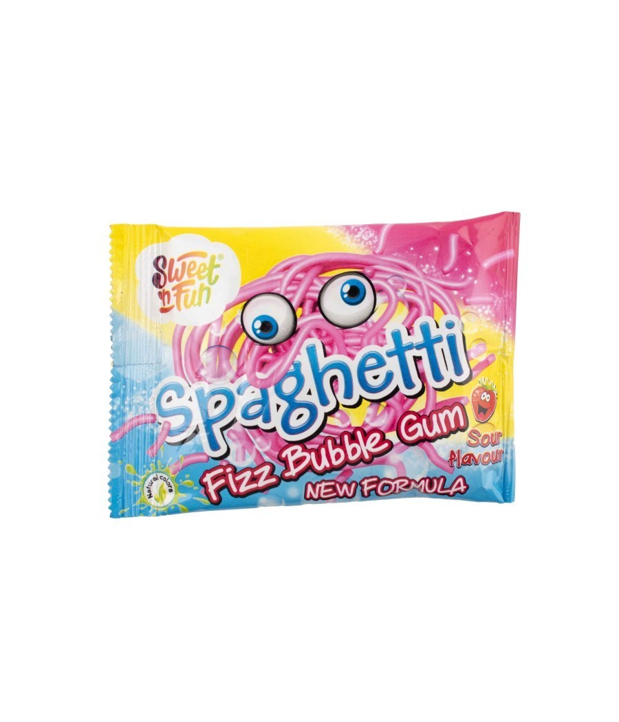 Guma Spaghetti Fizz oferă o experiență de consum diferită față de gumele clasice: fâșii lungi și subțiri, cu gust fructat și un efect efervescent discret. Copiii se pot juca cu forma înainte de a o mesteca, ceea ce adaugă o componentă de distracție. Aroma intensă și textura moale completează produsul.