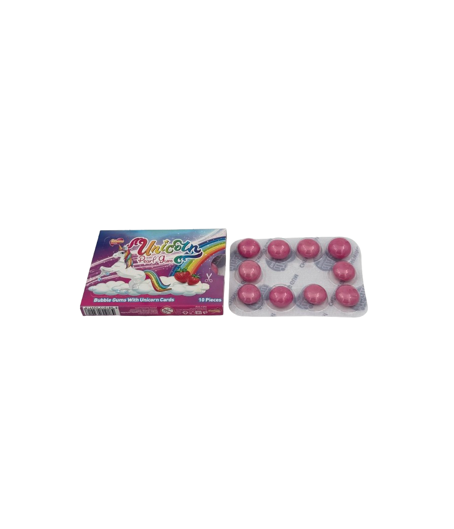 Guma de mestecat Unicorn Pearl Gum este biletul tău către o lume de basm plină de savoare. Fiecare pachet tip blister conține 10 perle de gumă cu aromă delicioasă de căpșuni și o surpriză specială: cartonașe de colecție cu unicorni magici. Este produsul ideal pentru a transforma orice gustare într-o aventură fantastică.