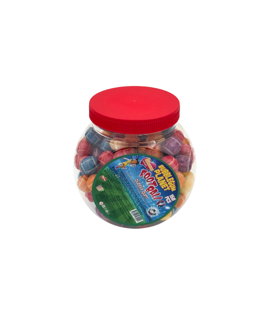 Football Bubble Gum vine într-un borcan transparent, ergonomic, dotat cu un capac sigur care menține gumele proaspete și aromate. Acest format este extrem de practic pentru consumul colectiv, oferind un număr mare de bucăți într-un spațiu compact. Este o soluție excelentă atât pentru consumul casnic, cât și pentru a fi expus pe tejgheaua magazinelor.